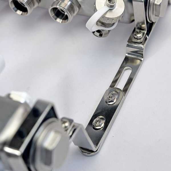 Коллекторный блок для водяного теплого пола и системы отопления оснащен от 2 до 12 выходами. Подсоединить трубопровод к ним можно с помощью фитингов «евроконус».