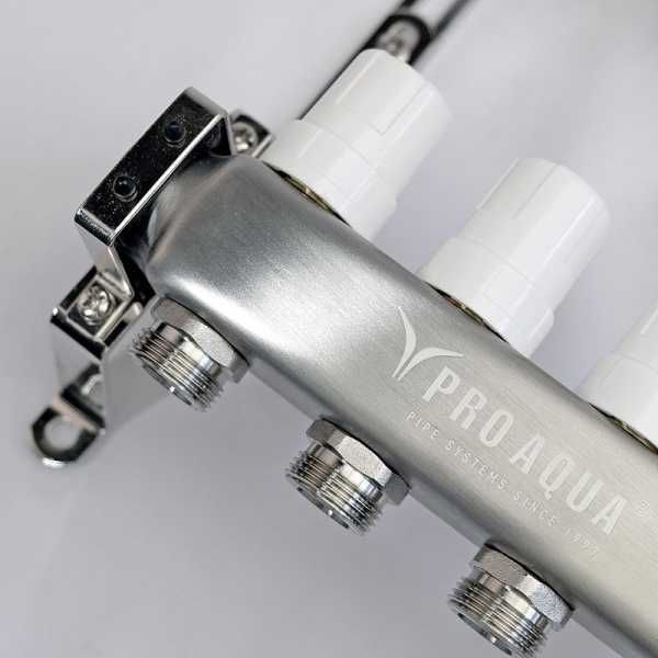 Коллекторный блок для водяного теплого пола и системы отопления оснащен от 2 до 12 выходами. Подсоединить трубопровод к ним можно с помощью фитингов «евроконус».